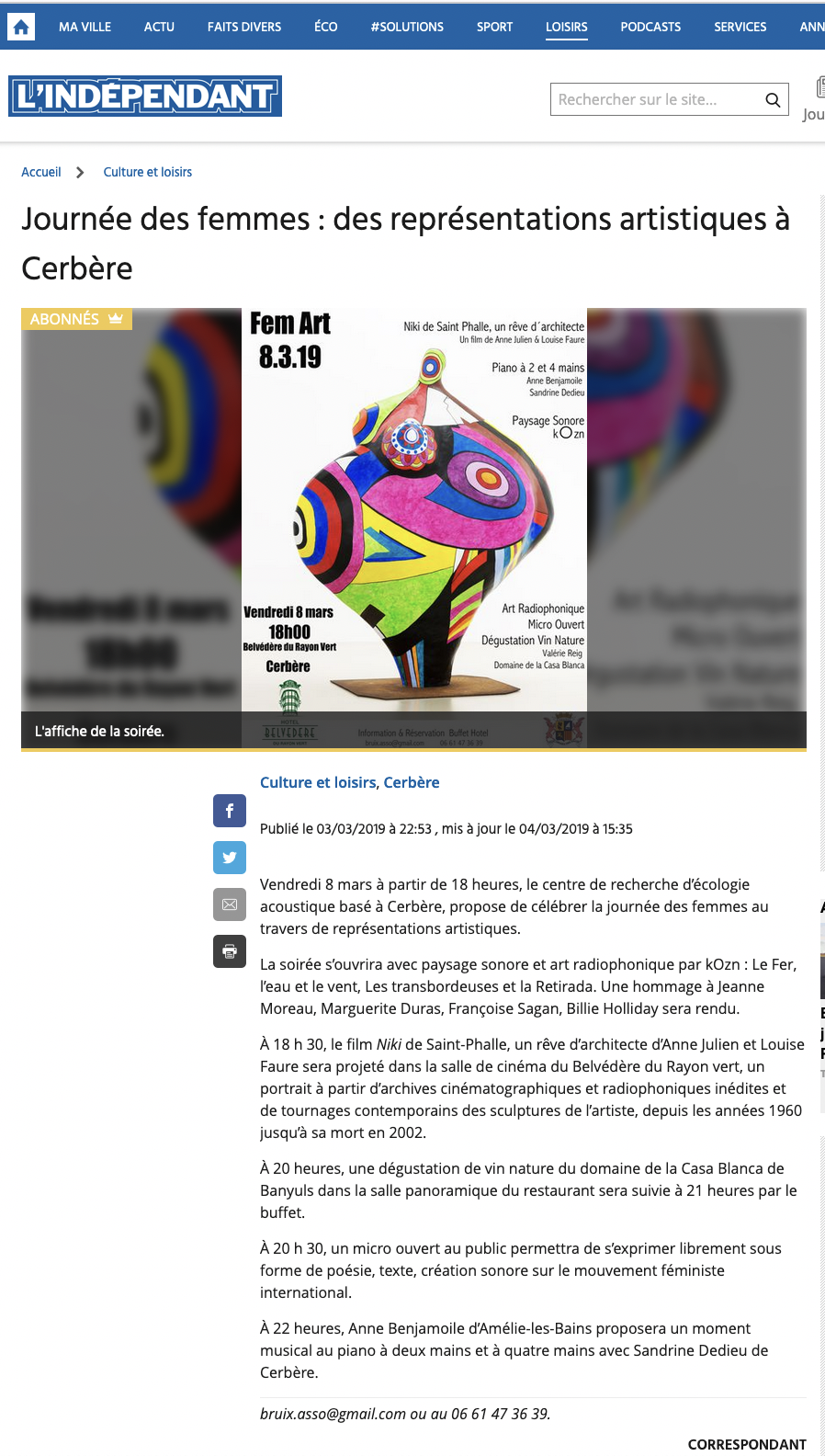 FemArt, qui signifit "Faisons de l ´ Art" en catalan, est une invitation à la création artistique partagée, pour une représentation artistique des différents courants du mouvement féministe international et se placer comme sujet historique avec la même volonté de Niki de Saint Phalle de ré jouïr les cœurs, les yeux, les oreilles et rendre les gens heureux.